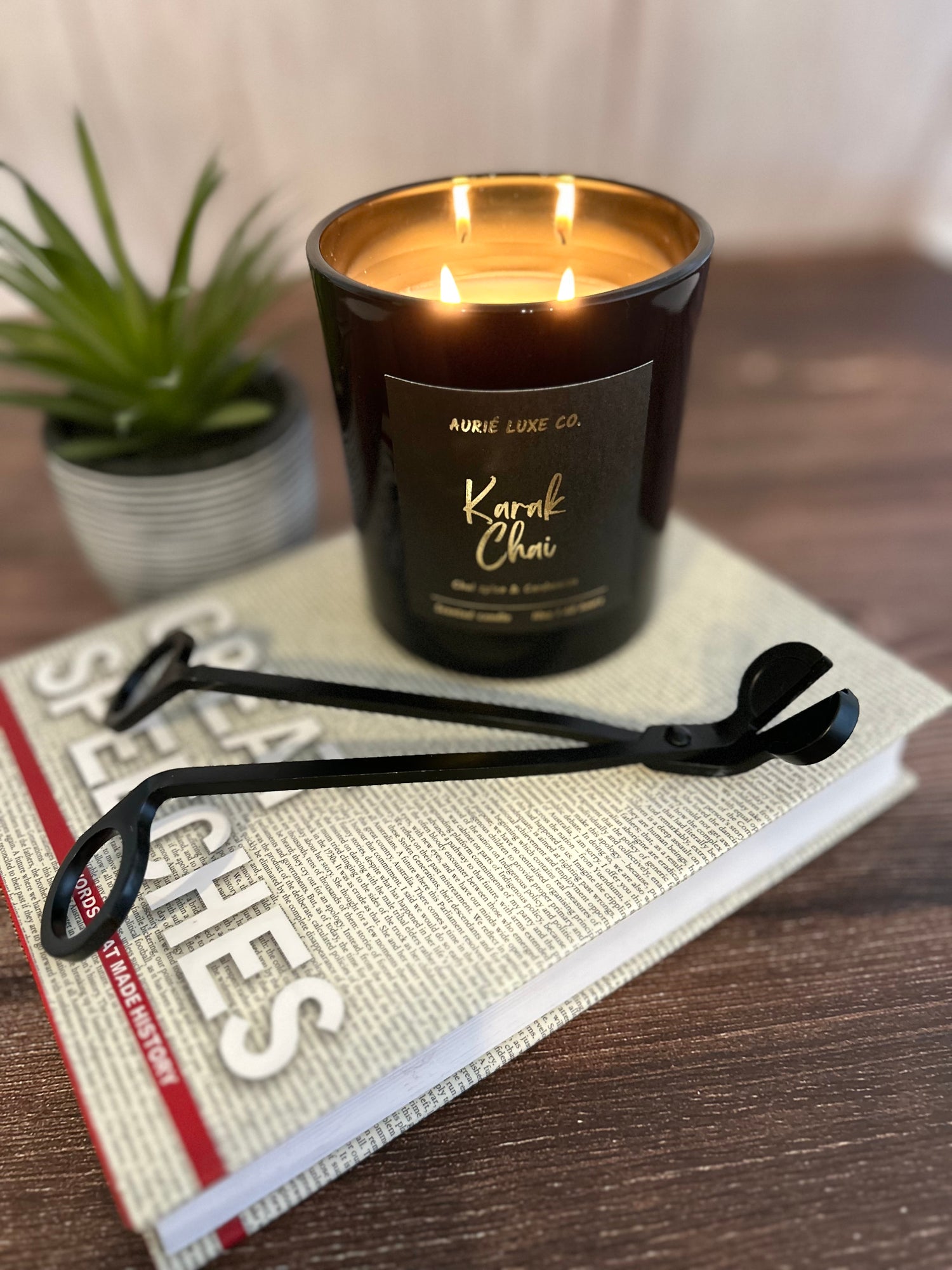 Before lighting your candle, always trim the wick to 1/4 inch to ensure a controlled, clean flame. This will prevent soot release and build-up in your candle and also helps your candle last longer!