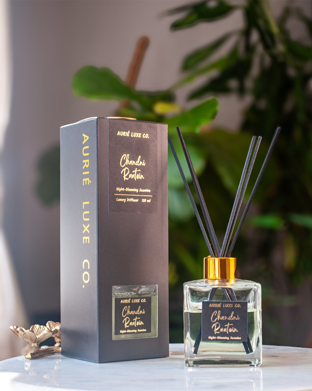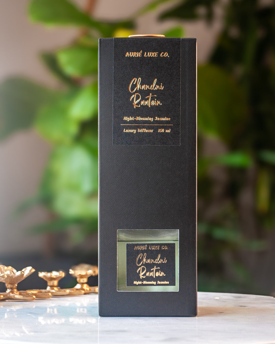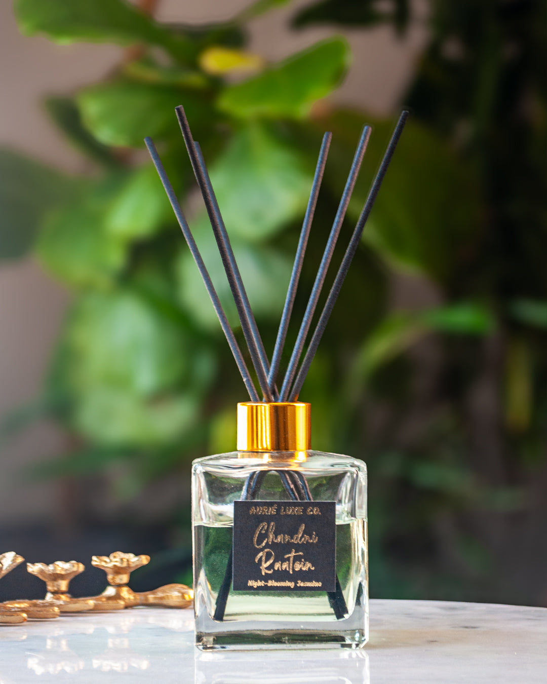 Inspired by the enchanting Raat ki Rani flower, Chandni Raatien captures the serenity of moonlit nights with its soft, jasmine-forward aroma. Housed in a sleek glass vessel, this diffuser offers a gentle, flame-free scent that lingers quietly — perfect for winding down or adding a touch of calm elegance to your space.